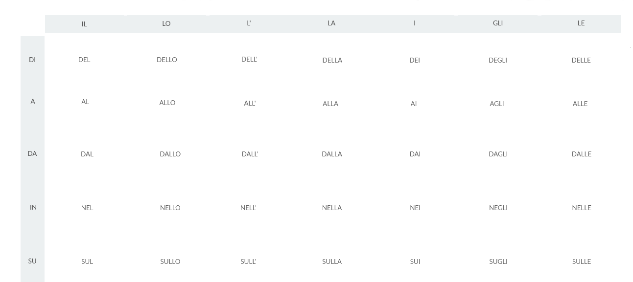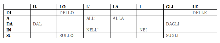 1- (A+il) matrimonio di Marisa sono venuto (con+i) miei fratelli 2- Sei (a+la) stazione? Perché sono davanti (a+l’) entrata! 3- (Per+il) mio compleanno vado (in+gli) Stati Uniti 4- Anche (di+i) miei amici vanno a ballare oggi, andiamo (in+lo) stesso posto? 5- (In+il) nuovo centro commerciale, (tra+il) negozio di scarpe e quello di occhiali, c’è un fast food buonissimo 6- Sono stanco (di+le) tue scuse, (con+l’) amore non si scherza! 7 – (A+le) 12 vado sempre (da+la) mia ragazza 8- (A+l’) estero ci sono molte opportunità (per+le) persone che parlano tante lingue 9- (Su+il) tavolo (di+la) cucina c’è il mio telefono 10- I miei genitori lavorano tutti giorni (da+le) 8 (a+le) 17