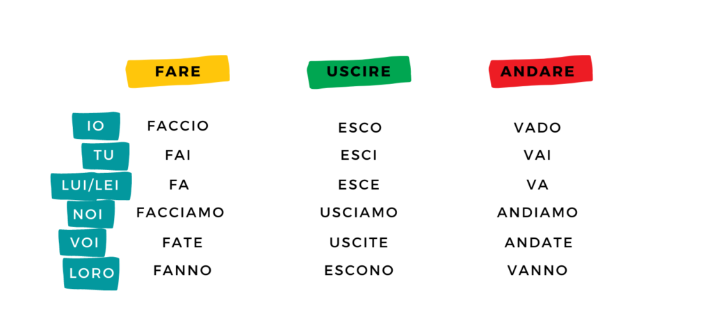 1 – Stasera noi ________ (uscire) con mio fratello. 2 – Questa estate i miei amici _________ (andare) (in/a) Italia, (in/a) Toscana, (in/a) Firenze. 3 – Io ______ (fare) il dottore, lavoro in ospedale. 4 – Dopo io _____ (andare) (in/a/da) Paolo, (io) gli ______ (dare) il mio libro preferito. 5 – Ascolta il professore, tu ______ (fare) i compiti! 6 – Perché Marco ______ (dare) i fiori a Maria? 7 – Tra 10 minuti mio papà _____ (fare) colazione, ____ (uscire) di casa e _____ (andare) al lavoro. 8 – Io _____ (dare) 100 dollari a Roberto, è il mio regalo! 9 – Loro _____ (andare) al concerto, è sicuro. 10 – Voi _____ (uscire) con i vostri genitori oggi?