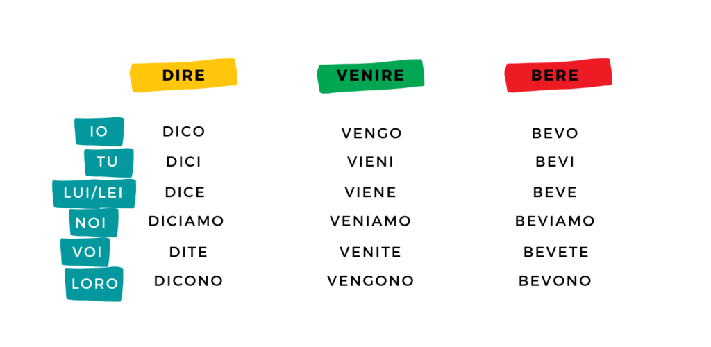 1 – Noi _____ (dire) sempre la verità! 2 – (Tu) _____ (venire) anche tu, perchè no?! 3 – Io _____ (bere) due birre e sono già ubriaco… 4 – Kevin non _____ (venire) oggi a lezione. 5 – Io _____ (dire) a Paolo tutti i miei segreti, solo a lui! 6 – I miei genitori non _____ (bere) mai la Coca Cola. 7 – Tu _____ (bere) 3 litri di acqua al giorno?! 8 – Ragazzi, _____ (dire) quello che pensate…. 9 – I miei bambini non _____ (dire) parolacce. 10 – Io _____ (venire) a casa tua ma tra 20 minuti.